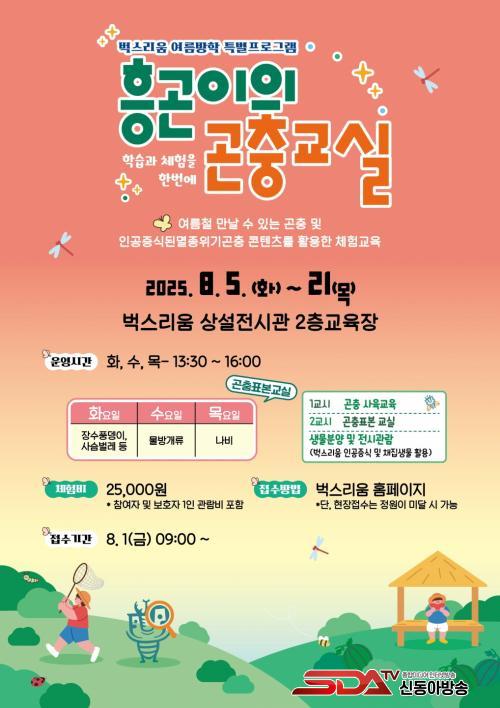 À̹ø ÇÁ·Î±×·¥Àº ¹÷½º¸®¿ò »ó¼³Àü½Ã°ü 2Ãþ ±³À°Àå¿¡¼­ ÁøÇàµÇ¸ç ¿©¸§Ã¶¿¡ ¸¸³¯ ¼ö ÀÖ´Â ´Ù¾çÇÑ °ïÃæÀÇ »ýÅÂ¿Í »çÀ° ¹æ¹ýÀ» ¹è¿ì°í Á÷Á¢ üÇèÇÒ ¼ö ÀÖµµ·Ï ±¸¼ºµÆ´Ù. ÃʵîÇб³ Á¤±Ô ±³°ú°úÁ¤°ú ¿¬°èÇØ ÇнÀ È¿°ú¸¦ ³ô¿´À¸¸ç, ¿©¸§¹æÇÐ ±â°£ ¾ÆÀ̵鿡°Ô À¯ÀÍÇÑ ÀÚ¿¬ ÇнÀÀÇ ±âȸ¸¦ Á¦°øÇÒ ¿¹Á¤ÀÌ´Ù.
