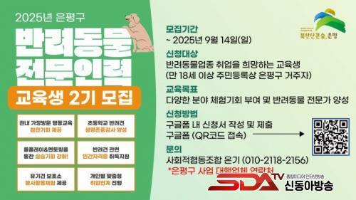[½Åµ¿¾Æ¹æ¼Û ÀºÆò±¸=À̽ŵ¿±âÀÚ] ¼­¿ï ÀºÆò±¸´Â ¹Ý·Áµ¿¹° Àü¹®°¡¸¦ ¾ç¼ºÇϰí Ã롤â¾÷À» ¿¬°è Áö¿øÇÏ´Â ¡®¹Ý·Áµ¿¹° Àü¹®Àη ¾ç¼º °úÁ¤¡® 2±â ±³À°»ýÀ» ¿À´Â 9¿ù 14ÀϱîÁö ¸ðÁýÇÑ´Ù°í ¹àÇû´Ù.