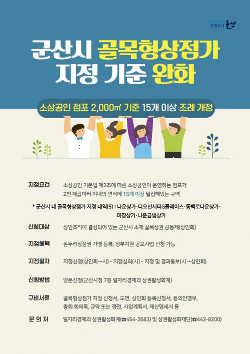 ½Ã´Â ÃÖ±Ù ¡®±º»ê½Ã °ñ¸ñÇü»óÁ¡°¡ ÁöÁ¤¿¡ °üÇÑ Á¶·Ê¡¯ °³Á¤À» ÅëÇØ ÁöÁ¤ ±âÁØÀ» ±âÁ¸ 2,000§³ À̳» ¸éÀû¿¡ ¼Ò»ó°øÀÎÀÌ ¿î¿µÇÏ´Â Á¡Æ÷ »ó¾÷Áö¿ª 25°³ ÀÌ»ó, ºñ»ó¾÷Áö¿ª 20°³ ÀÌ»ó ¹ÐÁý¿¡¼­ 15°³ ÀÌ»óÀ¸·Î ¹ÐÁý ±âÁØÀ» ¿ÏÈ­Çß´Ù.
