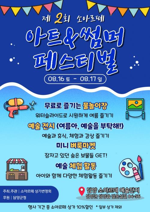 ¡®¼Ò¾Æ¸£¶¼¡¯ »ó°¡¹ø¿µÈ¸°¡ ÁÖÃÖ¡¤ÁÖ°üÇÏ°í ´ã¾ç±ºÀÌ ÈÄ¿øÇÏ´Â À̹ø Çà»ç´Â ¹æÇÐÀ» ¸ÂÀº °¡Á· °ü±¤°´°ú Áö¿ª¹ÎÀÌ ÇÔ²² Áñ±æ ¼ö ÀÖµµ·Ï ¹«·á ¹°³îÀÌÀå, ¡®¿©¸§¾Æ, ¿¹¼úÀ» ºÎÅ¹ÇØ!¡¯ Àü½Ã, º­·è½ÃÀå, ´Ù¾çÇÑ ¿¹¼ú üÇèÀ¸·Î ±¸¼ºµÆ´Ù.