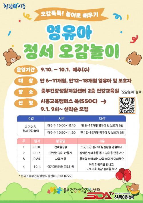 ±³À°Àº ¸¸ 6~11°³¿ù, 12°³¿ù~18°³¿ù ¿µÀ¯¾Æ ¹× º¸È£ÀÚ¸¦ ´ë»óÀ¸·Î ¿î¿µÇϸç, Áߺΰǰ»ýȰÁö¿ø¼¾ÅÍ 2Ãþ °Ç°±³À°½Ç¿¡¼ ÁøÇàµÈ´Ù. °¢ ȸÂ÷º° 8ÆÀ¾¿ ¸ðÁýÇÏ¸ç ½ÃÈï±³À°Ä·ÆÛ½º(SSOC) ½Ã½ºÅÛÀ» ÅëÇØ 9¿ù 1ÀϺÎÅÍ ½ÅûÇÒ ¼ö ÀÖ´Ù. ½Åû ÀοøÀÌ ¸¶°¨µÈ °æ¿ì ´ë±â ½Åûµµ °¡´ÉÇÏ´Ù.