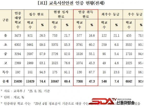 - Àüü ±³À°½Ã¼³ ¾ÈÀüÀÎÁõ ´ë»ó 15,630°³±³ Áß Àý¹Ýµµ ¾È µÇ´Â 7,388°³±³(47.3%)¸¸ÀÌ ÀÎÁõ ¿Ï·á