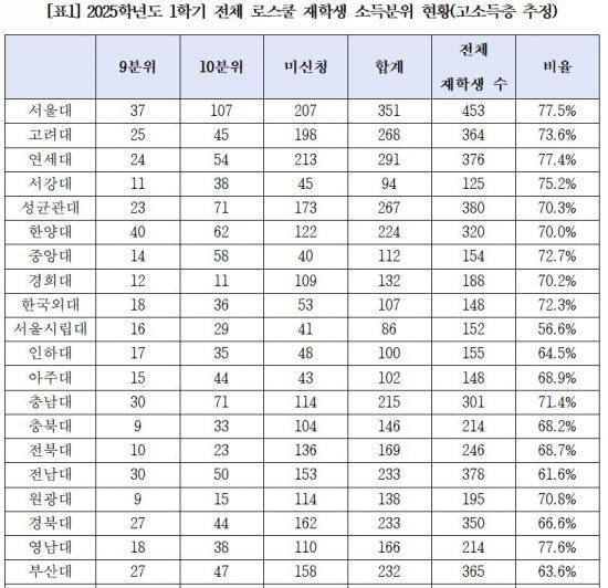¡à Çб³º° ºñÀ²Àº ¿µ³²´ë°¡ 77.6%·Î °¡Àå ³ô¾Ò°í ¡ã¼¿ï´ë¡¤ÀÌÈ¿©´ë °¢ 77.5% ¡ã¿¬¼¼´ë 77.4% ¡ã¼°´ë 75.2% ¡ã°í·Á´ë 73.6% ¡ãÁß¾Ó´ë 72.7% µî ´ëºÎºÐ ¼¿ï ¼ÒÀç ·Î½ºÄðÀÌ »óÀ§±ÇÀ» Â÷ÁöÇß´Ù. °í¼ÒµæÃþ ºñÀ²ÀÌ »ó´ëÀûÀ¸·Î ÀûÀº Çб³·Î´Â ¡ã¼¿ï½Ã¸³´ë 56.6% ¡ãµ¿¾Æ´ë 60.2% ¡ãÀü³²´ë 61.6% ¡ãÁ¦ÁÖ´ë 63.1% ¡ãºÎ»ê´ë 63.6% µîÀÌ ²ÅÇû´Ù.