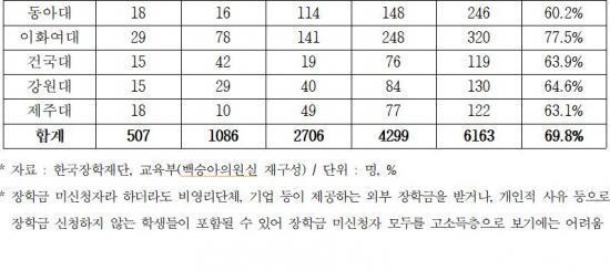 ¡à ±¹È¸ ±³À°À§¿øÈ¸ ¹é½Â¾Æ ÀÇ¿ø(´õºÒ¾î¹ÎÁÖ´ç)ÀÌ Çѱ¹ÀåÇÐÀç´Ü°ú ±³À°ºÎ¿¡¼ Á¦Ãâ¹ÞÀº ±¹Á¤°¨»ç ÀڷḦ ºÐ¼®ÇÑ °á°ú ¿ÃÇØ 1Çб⠷νºÄð ÀçÇлý 6,163¸í Áß °í¼ÒµæÃþ ÃßÁ¤ ºñÀ²Àº 69.8%(4,299¸í)·Î Áý°èµÆ´Ù. Àü³âµµ(68.2%)º¸´Ù 1.6%Æ÷ÀÎÆ® ´Ã¾î³ ±Ô¸ð´Ù.