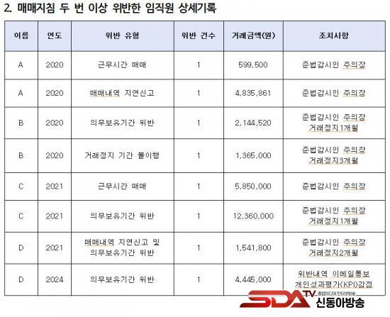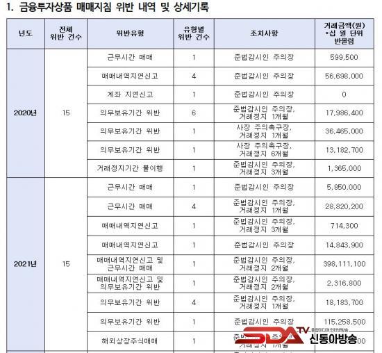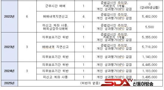 ÀÌ ¿Ü¿¡µµ ¡®¸Å¸Å³»¿ª Áö¿¬½Å°í¡¯(13°Ç), ¡®±Ù¹«½Ã°£ Áß ¸Å¸Å¡¯(8°Ç) µîÀÌ ´Ù¼ö Àû¹ßµÆ´Ù. ƯÈ÷, 2021³â¿¡´Â À§¹Ý °Å·¡¾×ÀÌ 3¾ï 9,811¸¸ ¿øÀ¸·Î ÃÖ´ëÄ¡¸¦ ±â·ÏÇßÀ¸¸ç, °ø½Ã Àü Á¤º¸¸¦ Ȱ¿ëÇÑ °ÍÀ¸·Î ÀǽɵǴ »ç·Êµµ ÀÖ¾ú´Ù. ÇØ´ç Á÷¿øÀº ¡®¸Å¸Å³»¿ª Áö¿¬½Å°í ¹× ±Ù¹«½Ã°£ ¸Å¸Å¡¯ º¹ÇÕ À§¹ÝÀÓ¿¡µµ ºÒ±¸ÇÏ°í ´Ü¼ø ÁÖÀÇÀå°ú 2°³¿ù °Å·¡Á¤Áö óºÐ¸¸ ¹Þ¾Ò´Ù.