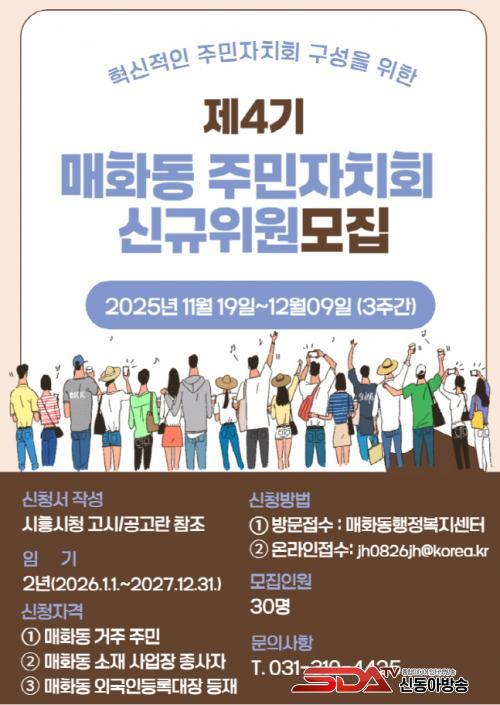 [½Åµ¿¾Æ¹æ¼Û ½ÃÈï½Ã=À̽ŵ¿±âÀÚ] ½ÃÈï½Ã ¸ÅÈ­µ¿ ÇàÁ¤º¹Áö¼¾ÅÍ´Â 12¿ù 9ÀϱîÁö ¡®Á¦4±â ¸ÅÈ­µ¿ ÁÖ¹ÎÀÚġȸ¡¯ ½Å±ÔÀ§¿ø 30¸íÀ» °ø°³ ¸ðÁýÇÑ´Ù. ½ÅûÀº ¸ÅÈ­µ¿ ÇàÁ¤º¹Áö¼¾ÅÍ ¹æ¹® ¶Ç´Â ÀüÀÚ¿ìÆíÀ» ÅëÇØ °¡´ÉÇÏ´Ù.