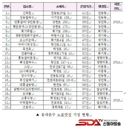 µ¿´ë¹®±¸´Â Áö¿ªÀÇ Á¤¼­¿Í ¿ª»ç¼ºÀ» Áö´Ñ ¿ì¼ö À½½ÄÁ¡À» ü°èÀûÀ¸·Î ¹ß±¼Çϰí È«º¸ÇϰíÀÚ 2023³â ¼­¿ï½Ã ÃÖÃʷΡ¸¼­¿ïƯº°½Ã µ¿´ë¹®±¸ ³ëÆ÷¸ÀÁý ÀÎÁõ ¹× Áö¿ø¿¡ °üÇÑ Á¶·Ê¡¹¸¦ Á¦Á¤Çß´Ù. ÀÌ¿¡ µû¶ó 30³â ÀÌ»ó ¿î¿µÇÑ ¾÷¼Ò¸¦ ´ë»óÀ¸·Î ½É»ç¸¦ °ÅÃÄ ³ëÆ÷¸ÀÁýÀ» ¼±Á¤Çϰí ÀÖÀ¸¸ç, ¿ÃÇØ´Â ½Å±Ô 4°³¼Ò°¡ Ãß°¡µÇ¾î ÃÑ 22°³¼Ò°¡ ³ëÆ÷¸ÀÁýÀ¸·Î ¿î¿µµÇ°í ÀÖ´Ù.