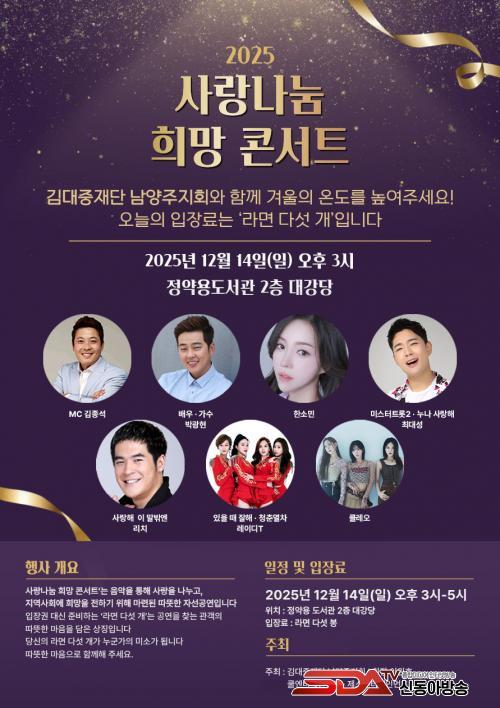 [½Åµ¿¾Æ¹æ¼Û] ¿Ã°Ü¿ï Áö¿ª »çȸ¸¦ µû¶æÇÏ°Ô Àû½Ç ¶æ±íÀº ÀÚ¼± °ø¿¬ ¡®2025 »ç¶û³ª´® Èñ¸Á Äܼ­Æ®¡¯°¡ ¿À´Â 12¿ù 14ÀÏ ¿ÀÈÄ 3½Ã, Á¤¾à¿ëµµ¼­°ü 2Ãþ ´ë°­´ç¿¡¼­ ¿­¸°´Ù. ±è´ëÁßÀç´Ü ³²¾çÁÖÁöȸ°¡ ÁÖÃÖÇÏ´Â À̹ø Çà»ç´Â À½¾ÇÀ» ÅëÇØ Èñ¸ÁÀ» ÀüÇÏ°í ¾î·Á¿î ÀÌ¿ôÀ» µ½´Â µ¥ ¸ñÀûÀ» µÎ°í ÀÖ´Ù.
