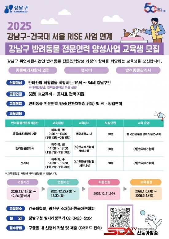 ±³À° °úÁ¤Àº µ¿¹°¸Å°³ÀçȰ»ç 2±Þ, ¹Ý·Áµ¿¹°°ü¸®»ç, Æê½ÃÅÍ µî 3°³ °úÁ¤ÀÌ´Ù. ±³À° ´ë»óÀº ¸¸ 19¼¼ ÀÌ»ó 64¼¼ ÀÌÇÏ °³²±¸ °ÅÁÖÀÚÀ̸ç, °¢ °úÁ¤´ç 20¸í¾¿ ÃÑ 60¸íÀ» ¼±¹ßÇÑ´Ù. ±³À°Àº °Ç±¹´ëÇб³°¡ ¸Ã°í, ¼¿ïÇü ¶óÀÌÁî(RISE) »ç¾÷°ú ¿¬°èÇØ ÁøÇàÇÑ´Ù.