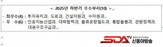 ¿ÃÇØ ÇϹݱâ ÃÖ¿ì¼öºÎ¼·Î´Â ÅõÀÚÀ¯Ä¡°ú, µµ·Î°ú, °Ç¼³Áö¿ø°ú, ¼öÀÚ¿ø°ú µî 4°³ ºÎ¼°¡ ¼±Á¤µÆ´Ù. ÀÌµé ºÎ¼´Â ºÐ¾ßº° ÇÙ½É Çö¾È¿¡¼ ¶Ñ·ÇÇÑ ¼º°ú¸¦ °ÅµÎ¸ç µµÁ¤ ¹ßÀü¿¡ Å©°Ô ±â¿©Çß´Ù.