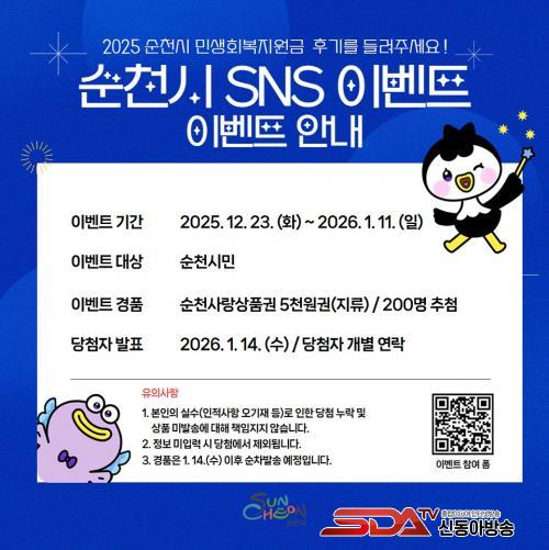 À̺¥Æ®´Â ¿À´Â 2026³â 1¿ù 11ÀϱîÁö ÁøÇàµÇ¸ç, ¼øÃµ½Ã¹Î ´©±¸³ª Âü¿©ÇÒ ¼ö ÀÖ´Ù. Âü¿©ÀÚ °¡¿îµ¥ 200¸íÀ» ÃßÃ·ÇØ ¼øÃµ»ç¶û»óǰ±Ç 5õ¿ø±Ç(Áö·ù)À» Á¦°øÇϸç, ´ç÷ÀÚ´Â 2026³â 1¿ù 14ÀÏ °³º° ¾È³»ÇÒ ¿¹Á¤ÀÌ´Ù.