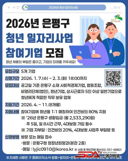 ¸ðÁý ´ë»óÀº ÀºÆò±¸¿¡ À§Ä¡ÇÑ ¡ã»çȸÀû°æÁ¦±â¾÷, ¡ãÇùµ¿Á¶ÇÕ, ¡ãºñ¿µ¸®´Üü(¹ýÀÎ), ¡ãû³â±â¾÷ ¶Ç´Â ¡ã»ó½Ã±Ù·ÎÀÚ 5ÀÎ ÀÌ»óÀÇ ÀϹݱâ¾÷À¸·Î¼ û³â¿¡°Ô ÀûÇÕÇÑ Á÷¹«¸¦ º¸À¯ÇÑ ¾÷ü´Ù. ±¸´Â ÃÑ 5°³ ±â¾÷À» ¼±Á¤ÇÒ ¿¹Á¤ÀÌ´Ù.