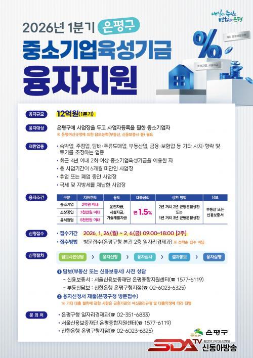 [½Åµ¿¾Æ¹æ¼Û ÀºÆò±¸=À̽ŵ¿±âÀÚ] ¼­¿ï ÀºÆò±¸´Â °ü³» Áß¼Ò±â¾÷°ú ¼Ò»ó°øÀÎÀÇ °æ¿µ ¾ÈÁ¤À» À§ÇØ ÃÑ 12¾ï ¿ø ±Ô¸ðÀÇ ¡®2026³â 1ºÐ±â Áß¼Ò±â¾÷ À°¼º±â±Ý À¶ÀÚÁö¿ø¡¯ »ç¾÷À» ½ÃÇàÇÑ´Ù°í ¹àÇû´Ù.