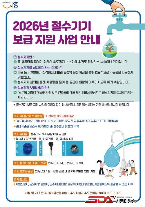 [½Åµ¿¾Æ¹æ¼Û ½ÃÈï½Ã=À̽ŵ¿±âÀÚ] ½ÃÈï½Ã´Â ¹° Àý¾à ¹®È­¸¦ È®»êÇϱâ À§ÇØ ¡®2026³â Àý¼ö±â±â º¸±Þ Áö¿ø»ç¾÷¡¯À» º»°ÝÀûÀ¸·Î ÃßÁøÇÑ´Ù. ¿ÃÇØ´Â À۳⺸´Ù Áö¿ø ´ë»óÀ» ³ÐÇô °ü³» Àú¼Òµæ Ãë¾à°èÃþ±îÁö ÃÑ 350¼¼´ë¿¡ °¡±¸´ç Àý¼ö±â±â 3Á¾(¾çº¯±â¿ë¤ýÁÖ¹æ¿ë¤ý»þ¿ö±â¿ë)À» ¹«»óÀ¸·Î Áö¿øÇÑ´Ù.