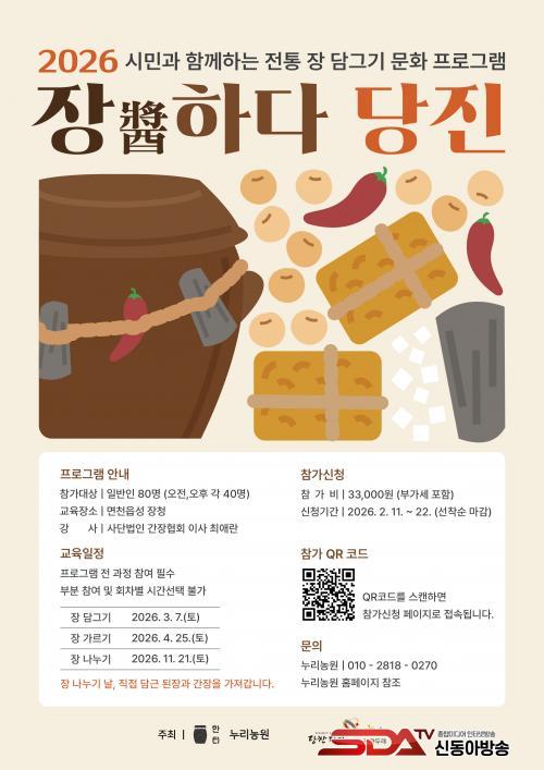 [½Åµ¿¾Æ¹æ¼Û=ÀÌÀçö±âÀÚ] ´çÁø½Ã´Â °ü±¤µÎ·¹ »ç¾÷ÀÇ ÀÏȯÀ¸·Î ½Ã¹Î°ú ÇÔ²²ÇÏ´Â ÀüÅë Àå ´ã±×±â ¹®È­ ÇÁ·Î±×·¥ ¡®Àå(íý)ÇÏ´Ù ´çÁø¡¯ Âü°¡ÀÚ¸¦ ¿À´Â 2¿ù 22ÀϱîÁö ¼±Âø¼ø ¸ðÁýÇÑ´Ù°í 13ÀÏ ¹àÇû´Ù.