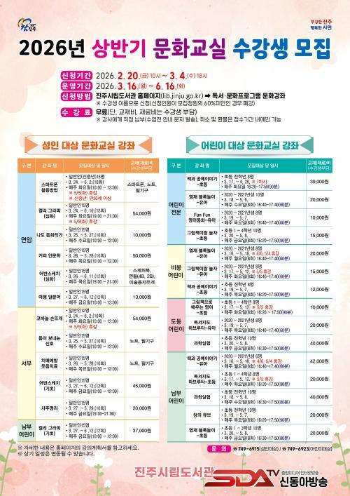 [½Åµ¿¾Æ¹æ¼Û °æ³²ÁøÁÖ=³²±Ã¿µ±â±âÀÚ] ÁøÁֽø³µµ¼­°üÀº ¿À´Â 20ÀϺÎÅÍ ¾î¸°ÀÌ¿Í ¼ºÀÎÀ» ´ë»óÀ¸·Î ¡®2026³â »ó¹Ý±â ¹®È­±³½Ç¡¯ ¼ö°­»ýÀ» ¸ðÁýÇÑ´Ù.