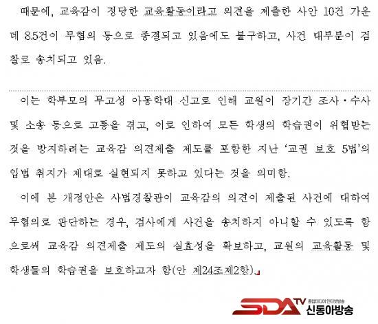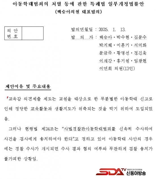 ¡à ÀÌ¿¡ ¹é½Â¾Æ ÀÇ¿øÀº »ç¹ý°æÂû°üÀÌ ±³À°°¨ÀÇ ÀǰßÀÌ Á¦ÃâµÈ »ç°Ç¿¡ ´ëÇÏ¿© ¹«ÇøÀÇ·Î ÆÇ´ÜÇÏ´Â °æ¿ì, °Ë»ç¿¡°Ô »ç°ÇÀ» ¼ÛÄ¡ÇÏÁö ¾ÊÀ» ¼ö ÀÖµµ·Ï ÇÔÀ¸·Î½á ±³À°°¨ ÀǰßÁ¦Ãâ Á¦µµÀÇ ½ÇÈ¿¼ºÀ» È®º¸Çϰí, ±³¿øÀÇ ±³À°È°µ¿ ¹× ÇлýµéÀÇ ÇнÀ±ÇÀ» º¸È£Çϱâ À§ÇÑ ¡¸¾Æµ¿Çдë¹üÁËÀÇ Ã³¹ú µî¿¡ °üÇÑ Æ¯·Ê¹ý ÀϺΰ³Á¤¹ý·ü¾È¡¹À» ´ëÇ¥¹ßÀÇÇß´Ù°í ¹àÇû´Ù.