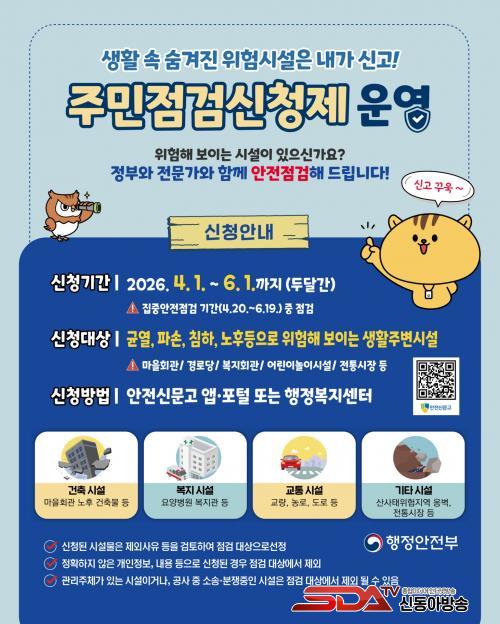 [½Åµ¿¾Æ¹æ¼Û=ÀÌÀçö±âÀÚ] ´çÁø½Ã´Â 2026³â ÁýÁß¾ÈÀüÁ¡°Ë ±â°£À» ¸Â¾Æ ¿À´Â 20ÀϺÎÅÍ 6¿ù 10ÀϱîÁö ½Ã¹ÎÀÌ ÀÏ»ó ¼Ó À§ÇèÀÌ ÀÖ´Ù°í ÆÇ´ÜµÇ´Â ½Ã¼³À» »çÀü¿¡ ¹ß±¼Çϰí Á¡°ËÇÏ´Â ¡®ÁýÁß¾ÈÀüÁ¡°Ë ÁÖ¹ÎÁ¡°Ë½ÅûÁ¦¡¯¸¦ ¿î¿µÇÑ´Ù°í 16ÀÏ ¹àÇû´Ù.