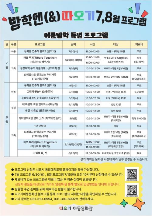 [½Åµ¿¾Æ¹æ¼Û ½ÃÈï½Ã=À̽ŵ¿±âÀÚ] ½ÃÈï½Ã µû¿À±â¾Æµ¿¹®È­°üÀº ¿©¸§¹æÇÐÀ» ¸Â¾Æ 7¿ù ¸»ºÎÅÍ 8¿ù±îÁö ¿Â °¡Á·ÀÌ ÇÔ²²ÇÒ ¼ö Àִ Ưº° ÇÁ·Î±×·¥ ¡®¹æÇп£(&)¡¯À» ¿î¿µÇÑ´Ù. ¡®¹æÇп£(&)¡¯Àº ¿©¸§¹æÇÐ µ¿¾È ¾Æµ¿°ú ¼ºÀÎ, °¡Á· µî ´Ù¾çÇÑ ´ë»óÀÌ Âü¿©ÇÒ ¼ö Àִ üÇèÇü ¹®¡¦