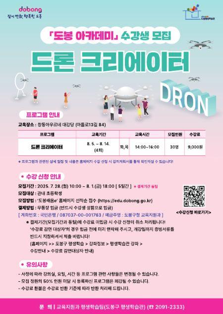 [½Åµ¿¾Æ¹æ¼Û µµºÀ±¸=À̽ŵ¿±âÀÚ] ¼­¿ï µµºÀ±¸°¡ Áö¿ª ³» ÃʵîÇлýÀ» ´ë»óÀ¸·Î 'µå·Ð Å©¸®¿¡ÀÌÅÍ °úÁ¤'À» ¿î¿µÇÑ´Ù. °­Á´ µµºÀ±¸ ÀΰøÁö´É(AI) Àü¹®±â¾÷ ¿¡ÀÌ·°½º¿Í ¿¬°èÇØ ÁøÇàµÇ¸ç, ÃÑ 4Â÷½Ã °úÁ¤À¸·Î ±¸¼ºµÆ´Ù. °­Á¿¡¼­´Â ±âº» ÀÌ·Ð, ½Ç½À ±³À°»Ó¸¸ ¾Æ´Ï¶ó µð¡¦