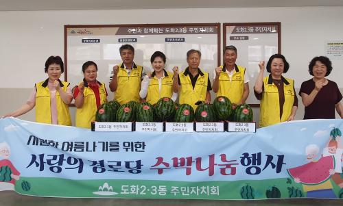 [½Åµ¿¾Æ¹æ¼Û ÀÎõ= À±¹Î½Ä ±âÀÚ]¹ÌÃßȦ±¸ µµÈ­2¡¤3µ¿ ÁÖ¹ÎÀÚġȸ(ȸÀå Á¤Çâ¿Á)´Â 25ÀÏ °ü³» 16°³ °æ·Î´ç¿¡ ½Ã¿øÇÑ ¼ö¹ÚÀ» Àü´ÞÇÏ¸ç ¾î¸£½ÅµéÀ» À§ÇÑ ¿©¸§Ã¶ ³ª´® Ȱµ¿À» ÁøÇàÇß´Ù. À̹ø ³ª´®Àº ÁÖ¹ÎÀÚÄ¡À§¿øµéÀÌ Á÷Á¢ ÀÚ¿øºÀ»ç¿¡ ³ª¼­ ¼ö¹ÚÀ» ÇÑ Å뾿 Àü´ÞÇϰí, ¾î¸£¡¦