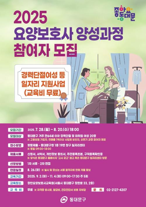 [½Åµ¿¾Æ¹æ¼Û µ¿´ë¹®±¸=À̽ŵ¿±âÀÚ] ¼­¿ï µ¿´ë¹®±¸´Â 7¿ù 28ÀϺÎÅÍ 8¿ù 20ÀϱîÁö °ü³»¿¡ °ÅÁÖ(Áֹεî·Ï ±âÁØ)ÇÏ´Â ¸¸ 64¼¼ ÀÌÇÏ °æ·Â´ÜÀý ¹× ¹ÌÃë¾÷ ¿©¼ºÀ» ´ë»óÀ¸·Î ¡®¿ä¾çº¸È£»ç ¾ç¼º°úÁ¤¡¯ Âü¿©ÀÚ¸¦ ¸ðÁýÇÑ´Ù. À̹ø °úÁ¤Àº °æ·Â´ÜÀý ¿©¼º µî¿¡°Ô Àü¹® ÀÚ°Ý Ãëµæ°ú ¡¦
