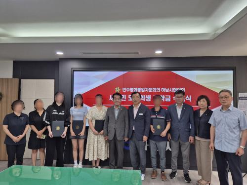 [½Åµ¿¾Æ¹æ¼Û Çϳ²½Ã=À̽ŵ¿±âÀÚ] ¹ÎÁÖÆòÈ­ÅëÀÏÀÚ¹®È¸ÀÇ Çϳ²½ÃÇùÀÇȸ´Â 31ÀÏ Çϳ²½ÃÀå½Ç¿¡¼­¡®ºÏÇÑÀÌÅ»ÁֹΠ°¡Á¤ ¸ð¹üÇлý ÀåÇÐ±Ý ¼ö¿©½Ä¡¯À» ¿­°í ´ëÇлý 2¸í, °íµîÇлý 2¸í µî ÃÑ 4¸í¿¡°Ô ÃÑ 300¸¸¿øÀÇ ÀåÇбÝÀ» Àü´ÞÇß´Ù. À̹ø ÀåÇбÝÀº ºÏÇÑÀÌÅ»ÁֹΠ°¡Á¤ ¸ð¹ü¡¦