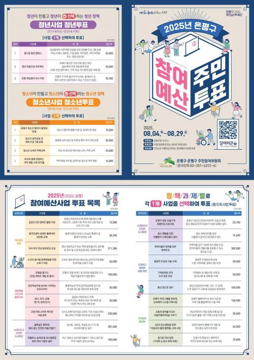 [½Åµ¿¾Æ¹æ¼Û ÀºÆò±¸=À̽ŵ¿±âÀÚ] ÀºÆò±¸´Â 2026³â¿¡ ½ÇÇàµÇ´Â Âü¿©¿¹»ê»ç¾÷ ¼±Á¤À» À§ÇÑ ÁÖ¹ÎÅõÇ¥¸¦ 4ÀϺÎÅÍ ¿À´Â 29ÀϱîÁö ÁøÇàÇÑ´Ù°í ¹àÇû´Ù. ÁÖ¹ÎÅõÇ¥´Â 5°³ÀÇ Á¤Ã¥°úÁ¦º°·Î °¡Àå ¼±È£ÇÏ´Â »ç¾÷À» 1°³¾¿ ¼±ÅÃÇÏ´Â ¹æ½ÄÀ¸·Î, ÃÑ 5°³ »ç¾÷¿¡ ÅõÇ¥ÇÏ°Ô µÈ´Ù. ÅõÇ¥ ´ë¡¦
