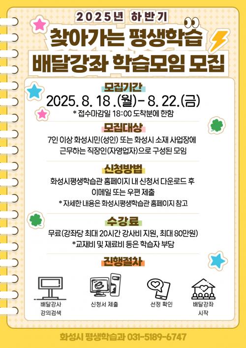 [½Åµ¿¾Æ¹æ¼Û=ÀÌÀçö±âÀÚ] È­¼ºÆ¯·Ê½Ã(½ÃÀå Á¤¸í±Ù)´Â ¿À´Â 8¿ù 18ÀϺÎÅÍ 22ÀϱîÁö 2025³â ÇϹݱ⠡¸Ã£¾Æ°¡´Â Æò»ýÇнÀ ¹è´Þ°­Á¡¹¿¡ Âü¿©ÇÒ ÇнÀ¸ðÀÓÀ» ¸ðÁýÇÑ´Ù. ¡®Ã£¾Æ°¡´Â Æò»ýÇнÀ ¹è´Þ°­Á¡¯´Â È­¼º½Ã¹Î ¶Ç´Â È­¼º½Ã ¼ÒÀç Á÷Àå¿¡ ±Ù¹«ÇÏ´Â Á÷ÀåÀÎÀÌ 7ÀÎ ÀÌ»óÀÇ ¡¦