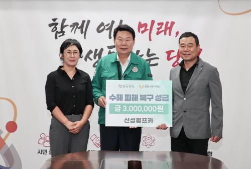 [½Åµ¿¾Æ¹æ¼Û=ÀÌÀçö±âÀÚ] ½Å¼ºÆßÇÁÄ«(´ëÇ¥ À±ÁÖ¸í)´Â 7ÀÏ ´çÁø½Ãû¿¡ ¹æ¹®ÇØ ¼öÇØ º¹±¸¸¦ À§ÇÑ ¼º±Ý 300¸¸ ¿øÀ» ´çÁø½Ã¿¡ ±âŹÇß´Ù. À±ÁÖ¸í ´ëÇ¥´Â ¡°¿¹±âÄ¡ ¸øÇÑ ¼öÇØ·Î ¾î·Á¿òÀ» °Þ´Â ÀÌ¿ôµé¿¡°Ô ÀÛ°Ô³ª¸¶ ÈûÀÌ µÇ±â¸¦ ¹Ù¶ó´Â ¸¶À½À¸·Î ¼º±ÝÀ» Àü´ÞÇÏ°Ô µÆ´Ù¡±¸ç, ¡¦