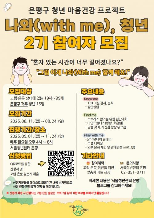[½Åµ¿¾Æ¹æ¼Û ÀºÆò±¸=À̽ŵ¿±âÀÚ] ¼­¿ï ÀºÆò±¸´Â °í¸³¡¤ÀºµÐ »óÅ¿¡ Àִ û³âÀ» ´ë»óÀ¸·Î ÀÏ»ó º¹±Í¿Í »çȸÀû °ü°è Çü¼ºÀ» µ½´Â û³â ¸¶À½°Ç°­ ÇÁ·ÎÁ§Æ® ¡®³ª¿Í(with me), û³â¡¯ 2±â Âü¿©ÀÚ¸¦ ¸ðÁýÇÑ´Ù°í ¹àÇû´Ù. À̹ø û³â ¸¶À½°Ç°­ ÇÁ·ÎÁ§Æ® ¡®³ª¿Í(with me), û³â¡¦