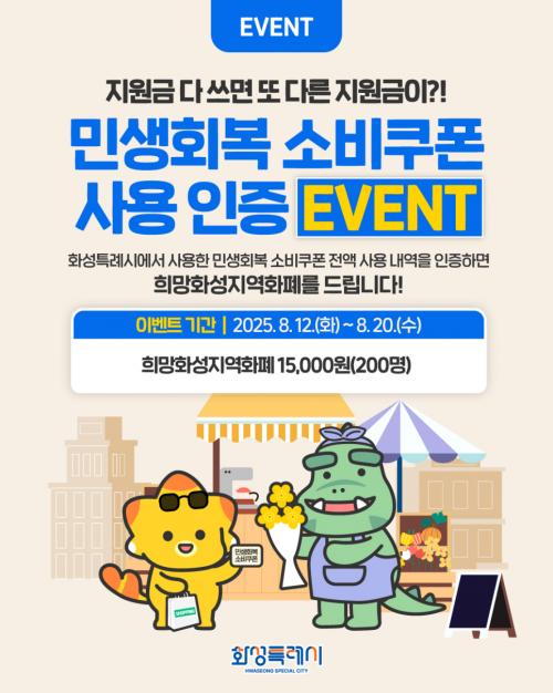 [½Åµ¿¾Æ¹æ¼Û=ÀÌÀçö±âÀÚ] È­¼ºÆ¯·Ê½Ã(½ÃÀå Á¤¸í±Ù)°¡ ¿À´Â 20ÀϱîÁö ¡®¹Î»ýȸº¹ ¼ÒºñÄíÆù Èıâ À̺¥Æ®¡¯¸¦ ¿î¿µÇÑ´Ù. À̹ø À̺¥Æ®´Â ¼Òºñ ÄíÆùÀ» Ȱ¿ëÇÑ ½Ã¹ÎµéÀÇ ÀÌ¿ë Èı⠰øÀ¯¸¦ ÅëÇØ ¼ÒºñÄíÆù »ç¿ë·üÀ» ³ôÀÓÀ¸·Î½á, Áö¿ª °æÁ¦ Ȱ¼ºÈ­¿Í ¹Î»ý ȸº¹ È¿°ú¸¦ ²ø¾î¿Ã¡¦