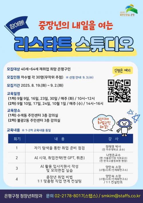 [½Åµ¿¾Æ¹æ¼Û ÀºÆò±¸=À̽ŵ¿±âÀÚ] ¼­¿ï ÀºÆò±¸´Â ³»´Þ 9ÀϺÎÅÍ 4ÁÖ°£ ÁßÀå³âÀ» À§ÇÑ ÀçÃë¾÷ Áö¿ø ÇÁ·Î±×·¥ ¡®¸®½ºÅ¸Æ® ½ºÆ©µð¿À¡¯¸¦ ¿î¿µÇÑ´Ù°í ¹àÇû´Ù. À̹ø ÇÁ·Î±×·¥Àº AI ±â¼ú°ú Âü¿©Çü ±³À° ¹æ½ÄÀ» °áÇÕÇØ ÁßÀå³âÃþÀÇ ÀçÃë¾÷ ¿ª·®À» ½ÇÁúÀûÀ¸·Î °­È­Çϰí, Àڽۨ¡¦