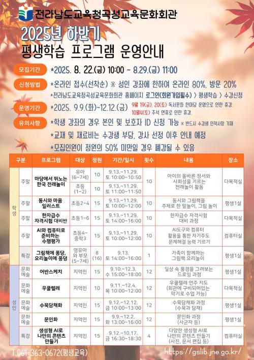 [½Åµ¿¾Æ¹æ¼Û Àü³²°î¼º=À̽ŵ¿±âÀÚ] Àü¶ó³²µµ±³À°Ã»°î¼º±³À°¹®È­È¸°üÀº 9¿ù 9ÀϺÎÅÍ 12¿ù 12ÀϱîÁö Çлý°ú Áö¿ª¹ÎÀ» ´ë»óÀ¸·Î¡®2025³â ÇÏ¹Ý±â Æò»ýÇнÀ ÇÁ·Î±×·¥¡¯À» ¿î¿µÇÑ´Ù. À¯¾Æ¿Í Çлý ´ë»ó ÇÁ·Î±×·¥À¸·Î´Â¡®¸¶´ç¿¡¼­ ¶Ù³ë´Â Çѱ¹ Àü·¡³îÀÌ¡¯,¡®µ¿½Ã¿Í ¸¶À½ ÀÏ·¯½º¡¦