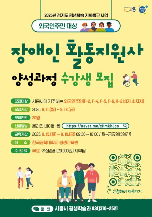 [½Åµ¿¾Æ¹æ¼Û ½ÃÈï½Ã=À̽ŵ¿±âÀÚ] ½ÃÈï½Ã´Â 2025³â °æ±âµµ Æò»ýÇнÀ ±âȸƯ±¸ »ç¾÷ÀÇ ÀÏȯÀ¸·Î, ¿Ü±¹ÀÎÁÖ¹ÎÀÇ ¾ÈÁ¤ÀûÀÎ Áö¿ª Á¤Âø°ú Ãë¾÷À» Áö¿øÇϱâ À§ÇØ ¡®Àå¾ÖÀÎȰµ¿Áö¿ø»ç ¾ç¼º°úÁ¤¡¯À» °³¼³ÇÏ°í ¿À´Â 9¿ù 12ÀϱîÁö ¼ö°­»ýÀ» ¸ðÁýÇÑ´Ù. À̹ø °úÁ¤Àº ½ÃÈï½Ã¿¡ °ÅÁÖ¡¦