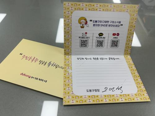 [½Åµ¿¾Æ¹æ¼Û µµºÀ±¸=À̽ŵ¿±âÀÚ] ¼­¿ï µµºÀ±¸°¡ ¼ºÀÎÀ¸·Î¼­ÀÇ Ã¹°ÉÀ½À» ³»µó´Â 17¼¼ ±¸¹Î¿¡°Ô ÀÌ´ÞºÎÅÍ Áֹεî·ÏÁõ ¹ß±Þ ½Ã Áֹεî·ÏÁõ°ú ÇÔ²² ÃàÇÏÄ«µå¸¦ Àü´ÞÇϰí ÀÖ´Ù°í ¹àÇû´Ù. »çȸ±¸¼º¿øÀ¸·Î¼­ ù °ø½Ä ½ÅºÐÁõÀ» °®´Â °ÍÀ» Áö¿ª °øµ¿Ã¼°¡ ÇÔ²² ÃàÇÏÇϱâ À§Çؼ­¡¦