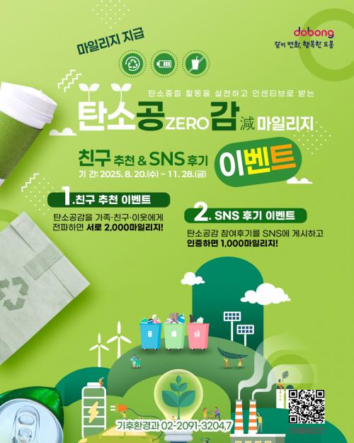 [½Åµ¿¾Æ¹æ¼Û µµºÀ±¸=À̽ŵ¿±âÀÚ] ¼­¿ï µµºÀ±¸°¡ 11¿ù 28ÀϱîÁö ź¼Ò°ø(Zero)°¨(Êõ)¸¶Àϸ®Áö Áö±Þ À̺¥Æ®¸¦ ÁøÇàÇÑ´Ù. ź¼Ò°ø°¨¸¶Àϸ®Áö´Â ±¸¿¡¼­ ¿î¿µÇϰí Àִ ȯ°æ¸¶Àϸ®Áö´Ù. ÀÏ»ó»ýȰ¿¡¼­ ź¼ÒÁ߸³À» ½ÇõÇÏ°í ¸¶Àϸ®Áö¸¦ Àû¸³Çϸé Áö¿ªÈ­ÆóÀÎ µµºÀ»ç¶û»óǰ±ÇÀ» ¡¦