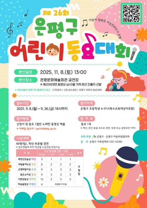 [½Åµ¿¾Æ¹æ¼Û ÀºÆò±¸=À̽ŵ¿±âÀÚ] ¼­¿ï ÀºÆò±¸´Â °ü³» ÃʵîÇлýÀ» ´ë»óÀ¸·Î ¡®Á¦26ȸ ÀºÆò±¸ ¾î¸°ÀÌ µ¿¿ä´ëȸ¡¯¸¦ °³ÃÖÇÏ°í ¿À´Â 26ÀϱîÁö Âü°¡ÀÚ ½ÅûÀ» ¹Þ´Â´Ù°í ¹àÇû´Ù. 11¿ù 8ÀÏ¿¡ ¿­¸®´Â ¡®ÀºÆò±¸ ¾î¸°ÀÌ µ¿¿ä´ëȸ¡¯´Â ¿ÃÇØ·Î 26ȸ¸¦ ¸ÂÀÌÇÑ´Ù. ÀÌ ´ëȸ´Â ¾î¸°ÀÌ¡¦
