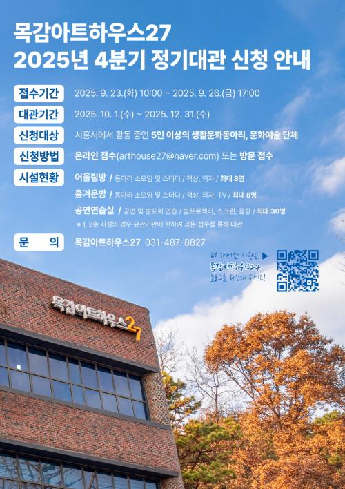 [½Åµ¿¾Æ¹æ¼Û ½ÃÈï½Ã=À̽ŵ¿±âÀÚ] ½ÃÈï½Ã´Â ¿À´Â 9¿ù 23ÀÏ 10½ÃºÎÅÍ 26ÀÏ 17½Ã±îÁö 4ºÐ±â Á¤±â´ë°ü ½Åû Á¢¼ö¸¦ ¹Þ´Â´Ù. ½Åû ´ë»óÀº ¸ñ°¨¾ÆÆ®ÇϿ콺27¿¡¼­ ½ÃÈï½Ã¿¡¼­ Ȱµ¿ ÁßÀÎ »ýȰ¹®È­µ¿¾Æ¸®¿Í ¹®È­¿¹¼ú ´Üü´Ù. ´ë°ü °¡´É °ø°£Àº µ¿¾Æ¸® ¼Ò¸ðÀÓ ¹× ½ºÅ͵ð·Î »ç¿ë¡¦
