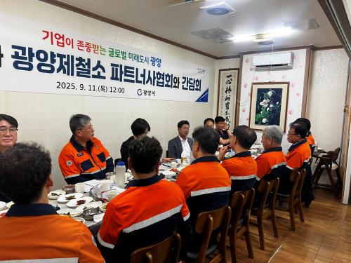 [½Åµ¿¾Æ¹æ¼Û Àü³²±¤¾ç=¹Ú±¤¿Á±âÀÚ] ±¤¾ç½Ã(½ÃÀå Á¤ÀÎÈ­)´Â 9¿ù 11ÀÏ ±¤¾çÁ¦Ã¶¼Ò ÆÄÆ®³Ê»çÇùȸ¿Í °£´ãȸ¸¦ ¿­°í, ±â¾÷ ÇöÀåÀÇ ¾Ö·Î»çÇ×À» ûÃëÇÏ¸ç »óÈ£ Çù·Â ¹æ¾ÈÀ» ³íÀÇÇß´Ù. °£´ãȸ¿¡´Â ±¤¾çÁ¦Ã¶¼Ò ÆÄÆ®³Ê»çÇùȸ ÇùȸÀåÀÎ ¢ßÆ÷½ºÇ÷¹ÀÌÆ® Á¤Çö¼ö ´ëÇ¥¸¦ ºñ·ÔÇØ (ÁÖ¡¦