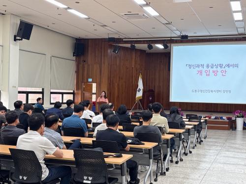 [½Åµ¿¾Æ¹æ¼Û µµºÀ±¸=À̽ŵ¿±âÀÚ] ¼­¿ï µµºÀ±¸°¡ Áö³­ 9¿ù 9ÀÏ µµºÀ°æÂû¼­ ¼Ò¼Ó ÆÄÃâ¼Ò¿Í Áö±¸´ë °æÂû 80¿© ¸íÀ» ´ë»óÀ¸·Î ¡®Á¤½ÅÀÀ±Þ°³ÀÔ ´ëÀÀ´É·Â Çâ»ó ±³À°¡¯À» ½Ç½ÃÇß´Ù. À̹ø ±³À°Àº Á¤½Å°Ç°­º¹Áö¹ý ½ÃÇà ÈÄ ÀÀ±Þ À§±â°³ÀÔ°ú ÀÀ±ÞÀÔ¿ø¿¡ ´ëÇÑ °æÂûÀÇ ¿ªÇÒÀÌ È®´ë¡¦