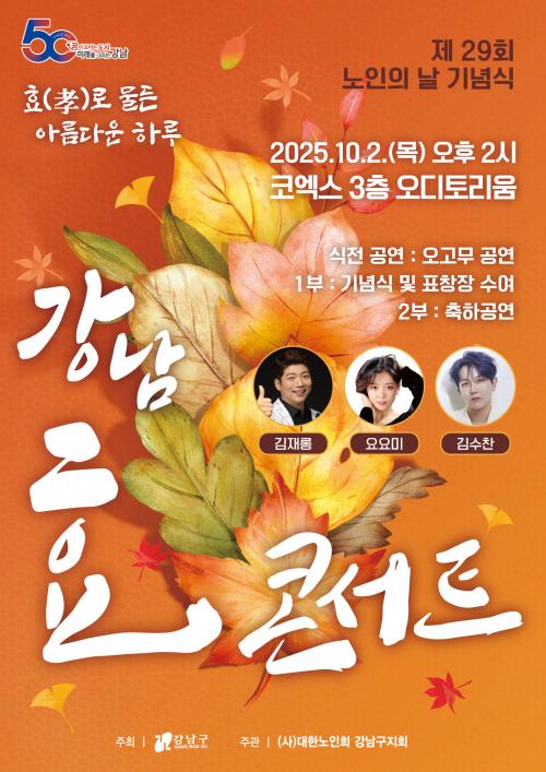 [½Åµ¿¾Æ¹æ¼Û °­³²±¸=À̽ŵ¿±âÀÚ] ²ÞÀÌ ¸ðÀÌ´Â µµ½Ã, ¹Ì·¡¸¦ ±×¸®´Â °­³²±¸°¡ Á¦29ȸ ³ëÀÎÀÇ ³¯À» ¸Â¾Æ ¿À´Â 10¿ù 2ÀÏ ¿ÀÈÄ 2½Ã, ÄÚ¿¢½º 3Ãþ ¿ÀµðÅ丮¿ò¿¡¼­ ¾î¸£½Å 1,000¿© ¸íÀ» ÃÊ´ëÇØ ¡®È¿(üø)·Î ¹°µç ¾Æ¸§´Ù¿î ÇϷ硯¸¦ ÁÖÁ¦·Î ±â³äÇà»ç¸¦ ¿¬´Ù. ³ëÀÎÀÇ ³¯Àº °æ·Î¡¦