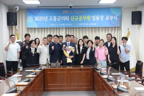 [½Åµ¿¾Æ¹æ¼Û °íÈï=¹Ú±¤¿Á±âÀÚ] °íÈﱺÀÇȸ(ÀÇÀå ·ùÁ¦µ¿)´Â ¼ÒȸÀǽǿ¡¼­ 2025³â 9¿ù 29ÀÏ ÀÚ Àλç¹ß·É¿¡ µû¸¥ ½Å±Ô °ø¹«¿ø ÀÓ¿ëÀå ±³ºÎ½ÄÀ» °¡Á³´Ù. À̹ø ±³ºÎ½ÄÀº 2025³â Àü¶ó³²µµ Áö¹æ°ø¹«¿ø °øÃ¤½ÃÇè¿¡¼­ ÃÖÁ¾ ÇÕ°ÝÇÑ ½Å±Ô Á÷¿ø¿¡°Ô ÀÓ¿ëÀåÀ» ¼ö¿©Çϰí ȯ¿µ Àλç¿Í¡¦