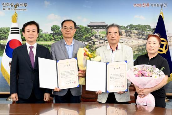 [½Åµ¿¾Æ¹æ¼Û °æ³²ÁøÁÖ=³²±Ã¿µ±â±âÀÚ] ÁøÁֽô 2ÀÏ 6¡¤25ÀüÀï ÂüÀü À¯°øÀÚÀÎ ¡®Íº ±èÆÇ½Ä ÀϺ´¡¯°ú ¡®Íº À±µµ±â ÀϺ´¡¯ÀÇ À¯°¡Á·ÀÎ °íÀεéÀÇ Á¶Ä« ±èÇü¿ø, À±¼º¼ö ¾¾¿¡°Ô °¢°¢ È­¶û¹«°øÈÆÀåÀ» Àü¼öÇß´Ù. À̹ø ÈÆÀå Àü¼ö½ÄÀº ±¹¹æºÎ¿Í À°±ºº»ºÎÀÇ ¡®6¡¤25ÀüÀï ¹«°øÈÆÀ塦