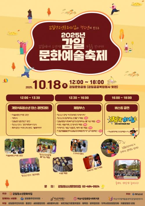 [½Åµ¿¾Æ¹æ¼Û Çϳ²½Ã=À̽ŵ¿±âÀÚ] Çϳ²½Ã °¨ÀÏû¼Ò³â¹®È­ÀÇÁýÀº ¿À´Â 10¿ù 18ÀÏ(Åä) ¿ÀÈÄ 12½ÃºÎÅÍ 18½Ã±îÁö °¨ÀϹ®È­°ø¿ø(°¨Àϰø°øº¹ÇÕû»ç µÞÆí)¿¡¼­ ¡¸Á¦2ȸ °¨ÀϹ®È­¿¹¼úÃàÁ¦¡¹¸¦ °³ÃÖÇÑ´Ù. Áö³­ÇØ Ã³À½ ¿­¸° °¨ÀϹ®È­¿¹¼úÃàÁ¦´Â û¼Ò³âÀÌ ÁÖü°¡ µÇ¾î ¿î¿µÇÑ¡¦