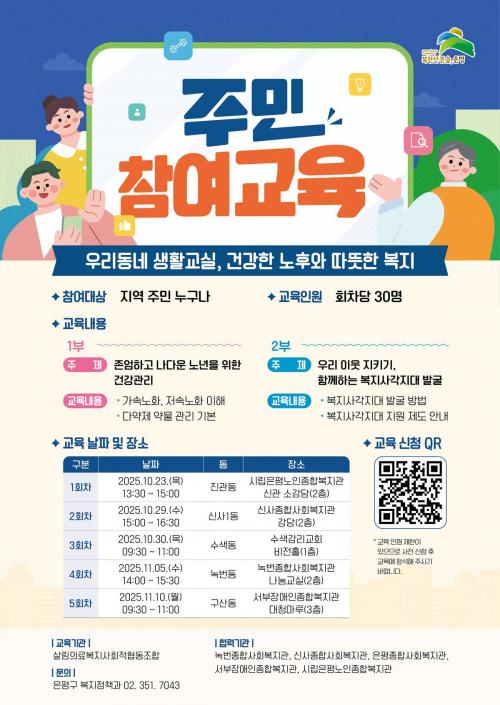 [½Åµ¿¾Æ¹æ¼Û ÀºÆò±¸=À̽ŵ¿±âÀÚ] ¼­¿ï ÀºÆò±¸´Â ÁֹΠÂü¿© ±³À° ¡®¿ì¸®µ¿³× »ýȰ ±³½Ç, °Ç°­ÇÑ ³ëÈÄ¿Í µû¶æÇÑ º¹Áö¡¯¸¦ ¿î¿µÇÏ°í ½ÅûÀÚ¸¦ ¸ðÁýÇÑ´Ù°í ¹àÇû´Ù. À̹ø ±³À°Àº ÁÖº¯ÀÇ º¹Áö »ç°¢Áö´ë¸¦ ÇÔ²² »ìÇÇ´Â Áö¿ª °øµ¿Ã¼ ¹®È­ È®»ê°ú ÁֹΠ½º½º·Î °Ç°­ÇÑ ³ëÈĸ¦ ÁØ¡¦
