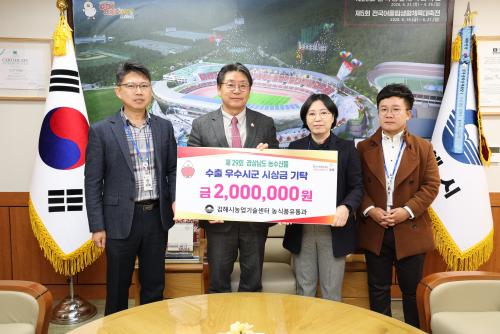 [½Åµ¿¾Æ¹æ¼Û °æ³²±èÇØ=³²±Ã¿µ±â±âÀÚ] ±èÇØ½Ã³ó¾÷±â¼ú¼¾ÅÍ ³ó½ÄǰÀ¯Åë°ú°¡ ¼öÃ⠽ûó±Ý 200¸¸¿øÀ» ÀÌ¿ôµ½±â¿¡ ÄèôÇß´Ù. 18ÀÏ ±èÇØ½Ã¿¡ µû¸£¸é ±âʱÝÀº Á¦29ȸ °æ³²µµ ³ó¼ö»ê¹° ¼öÃâž ½Ã»ó½Ä¿¡¼­ ±èÇØ½Ã°¡ ³ó¼ö»ê½Äǰ ¼öÃâ ¿ì¼ö ½Ã¡¤±º ºÎ¹® Àå·Á»óÀ» ¼ö»óÇÏ¸ç ¹Þ¡¦