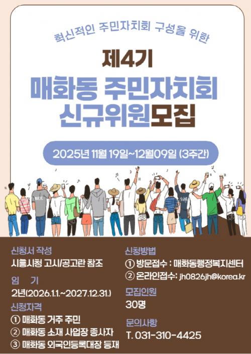 [½Åµ¿¾Æ¹æ¼Û ½ÃÈï½Ã=À̽ŵ¿±âÀÚ] ½ÃÈï½Ã ¸ÅÈ­µ¿ ÇàÁ¤º¹Áö¼¾ÅÍ´Â 12¿ù 9ÀϱîÁö ¡®Á¦4±â ¸ÅÈ­µ¿ ÁÖ¹ÎÀÚġȸ¡¯ ½Å±ÔÀ§¿ø 30¸íÀ» °ø°³ ¸ðÁýÇÑ´Ù. ½ÅûÀº ¸ÅÈ­µ¿ ÇàÁ¤º¹Áö¼¾ÅÍ ¹æ¹® ¶Ç´Â ÀüÀÚ¿ìÆíÀ» ÅëÇØ °¡´ÉÇÏ´Ù. ¸ÅÈ­µ¿ ÁÖ¹ÎÀÚġȸ´Â Áö¿ªÀÇ ´Ù¾çÇÑ Çö¾È¿¡ ´ëÇØ ÁֹΠ½º¡¦