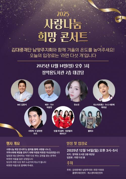 [½Åµ¿¾Æ¹æ¼Û] ¿Ã°Ü¿ï Áö¿ª »çȸ¸¦ µû¶æÇÏ°Ô Àû½Ç ¶æ±íÀº ÀÚ¼± °ø¿¬ ¡®2025 »ç¶û³ª´® Èñ¸Á Äܼ­Æ®¡¯°¡ ¿À´Â 12¿ù 14ÀÏ ¿ÀÈÄ 3½Ã, Á¤¾à¿ëµµ¼­°ü 2Ãþ ´ë°­´ç¿¡¼­ ¿­¸°´Ù. ±è´ëÁßÀç´Ü ³²¾çÁÖÁöȸ°¡ ÁÖÃÖÇÏ´Â À̹ø Çà»ç´Â À½¾ÇÀ» ÅëÇØ Èñ¸ÁÀ» ÀüÇÏ°í ¾î·Á¿î ÀÌ¿ôÀ» µ½´Â µ¥ ¸ñ¡¦