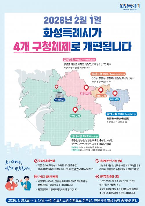 [½Åµ¿¾Æ¹æ¼Û=ÀÌÀçö±âÀÚ] 4°³ ÀϹݱ¸Ã» °³Ã»À̶ó´Â ÇàÁ¤Ã¼°è ´ëÀüȯÀÌ 2ÁÖ ¾ÕÀ¸·Î ´Ù°¡¿Â °¡¿îµ¥ È­¼ºÆ¯·Ê½Ã°¡ ¸·¹ÙÁö °³Ã» Áغñ¿¡ ¹ÚÂ÷¸¦ °¡Çϰí ÀÖ´Ù. ¸¸¼¼±¸Ã»Àº È­¼ºÁ¾ÇÕ°æ±âŸ¿î¿¡ ¸¶·ÃµÇ¸ç, ¿ìÁ¤À¾, Çâ³²À¾, ³²¾çÀ¾, ¸¶µµ¸é, ¼Û»ê¸é, ¼­½Å¸é, ÆÈź¸é, Àå¾È¸é, ¡¦